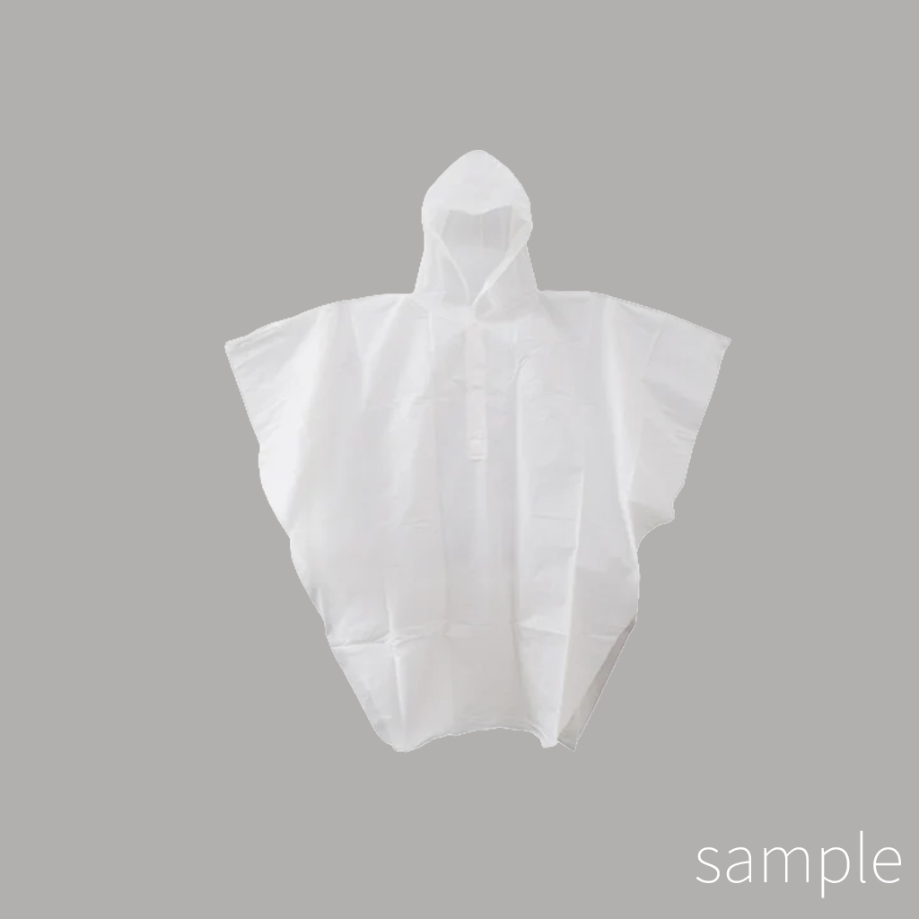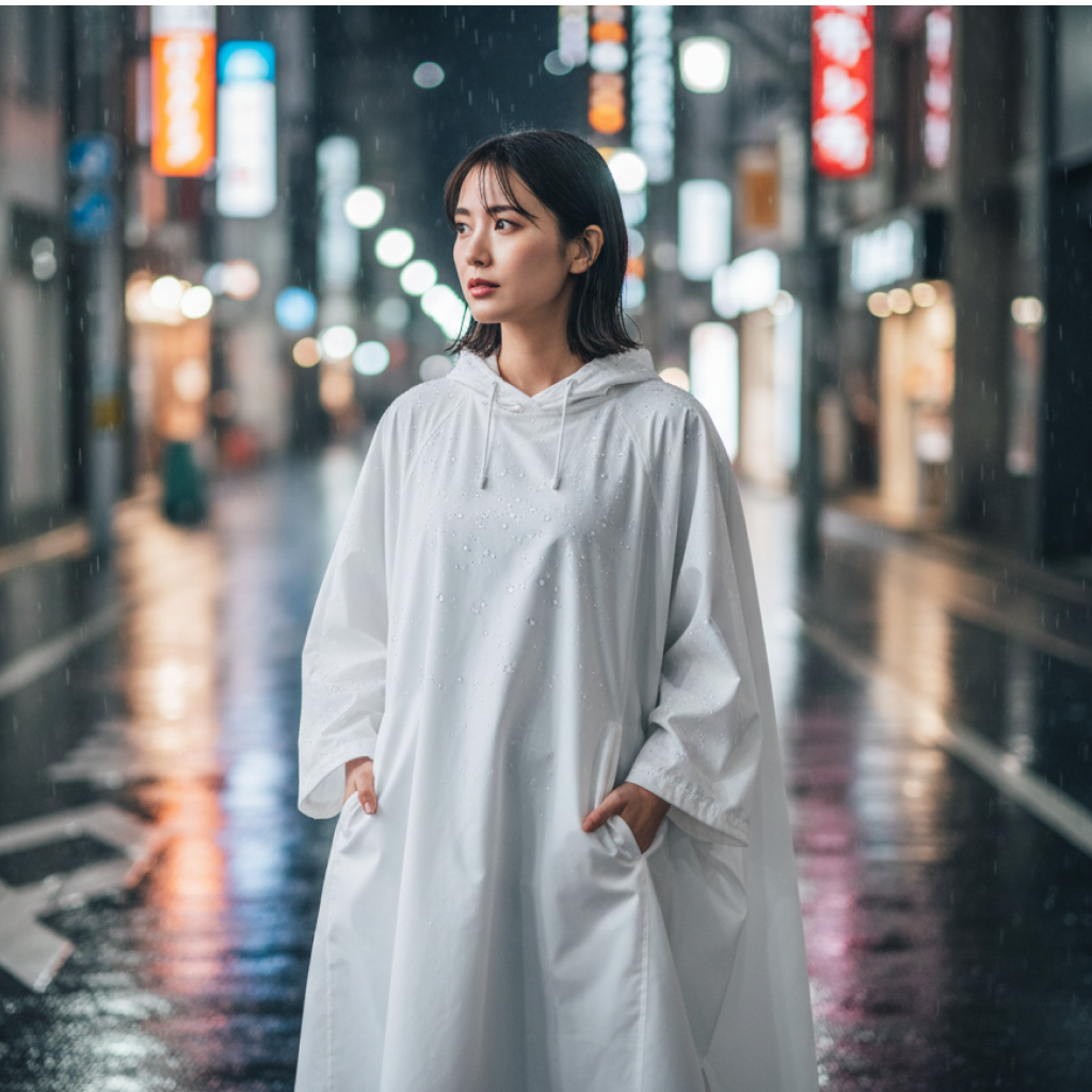 白色のポンチョを着た若い女性が雨上がりに歩いている画像生成