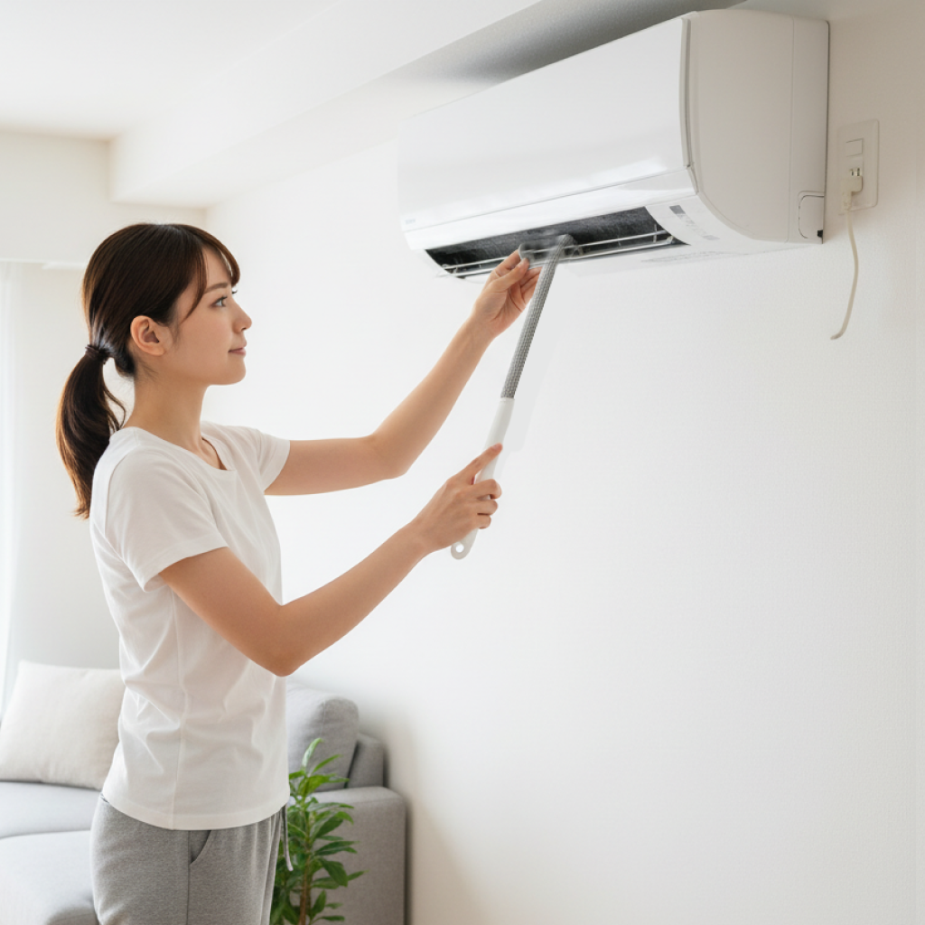 エアコンのお掃除スティックを使ってリビングでエアコンを掃除している若い女性画像生成